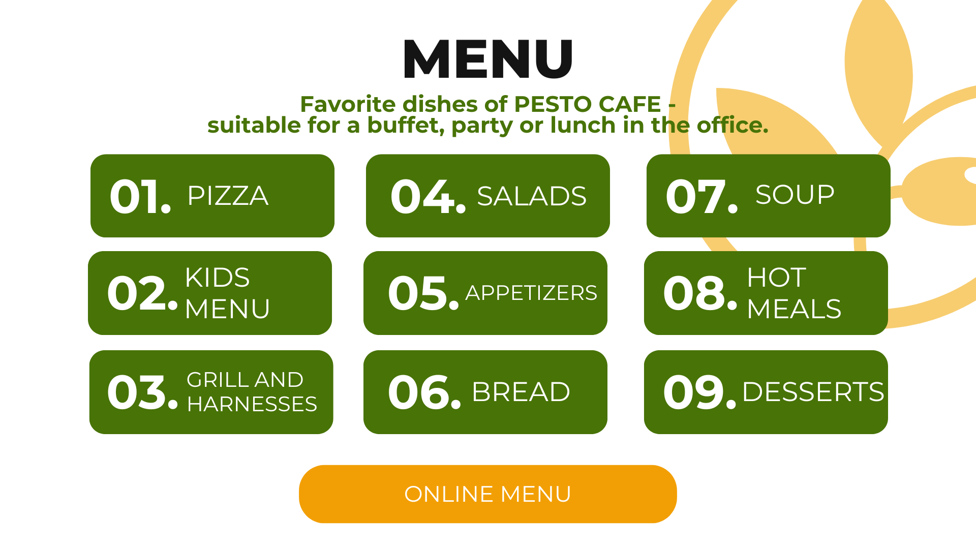 PESTO CAFE offers catering services for all types of events: office meetings, home celebrations, kids’ birthdays, corporate events and weddings.