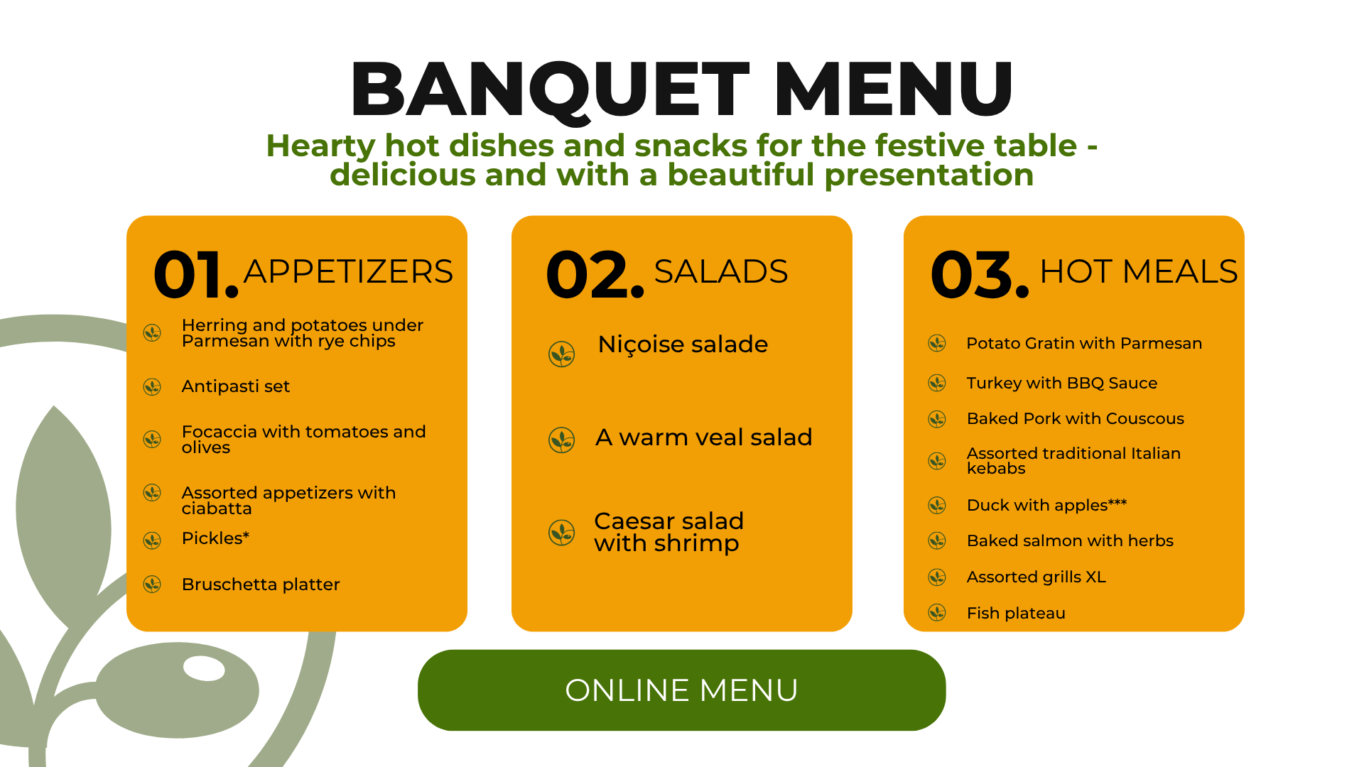 We provide ready-made solutions for buffets, banquets, and festive meals, with delivery available across Kyiv and Kyiv region.