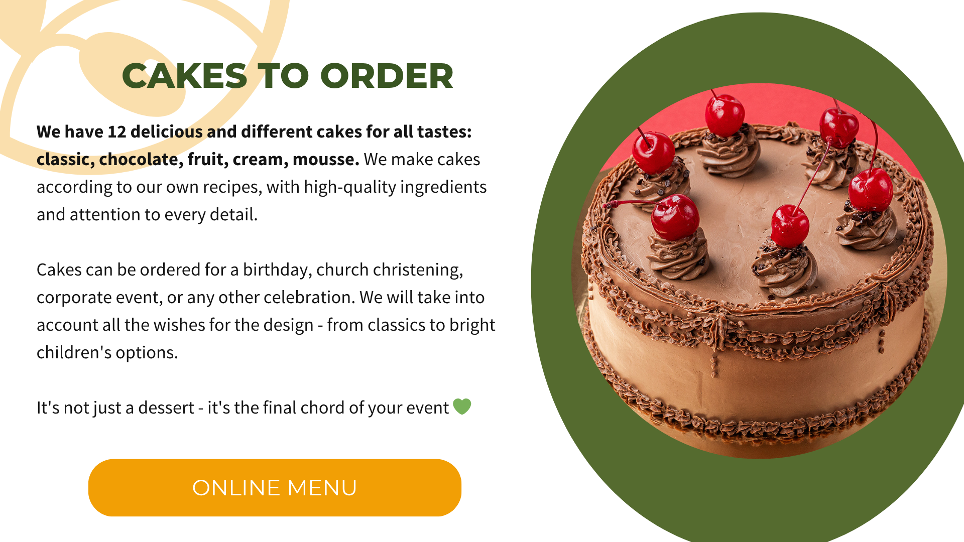 Our menu includes main courses, appetizers, desserts, homemade drinks, and custom cakes.
